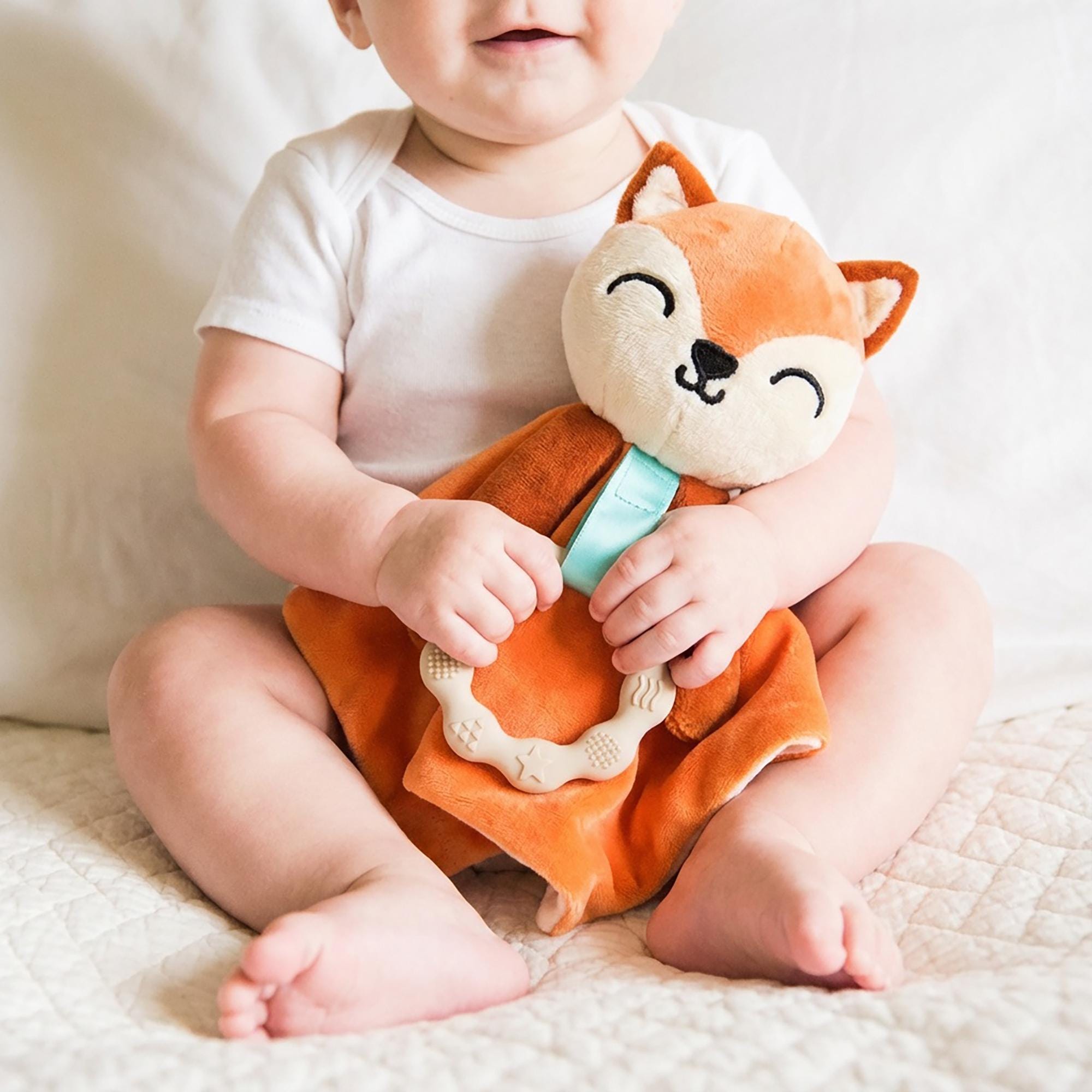 - 1 plush stuffed animal lovey for baby with detachable teething ring for easy cleaning