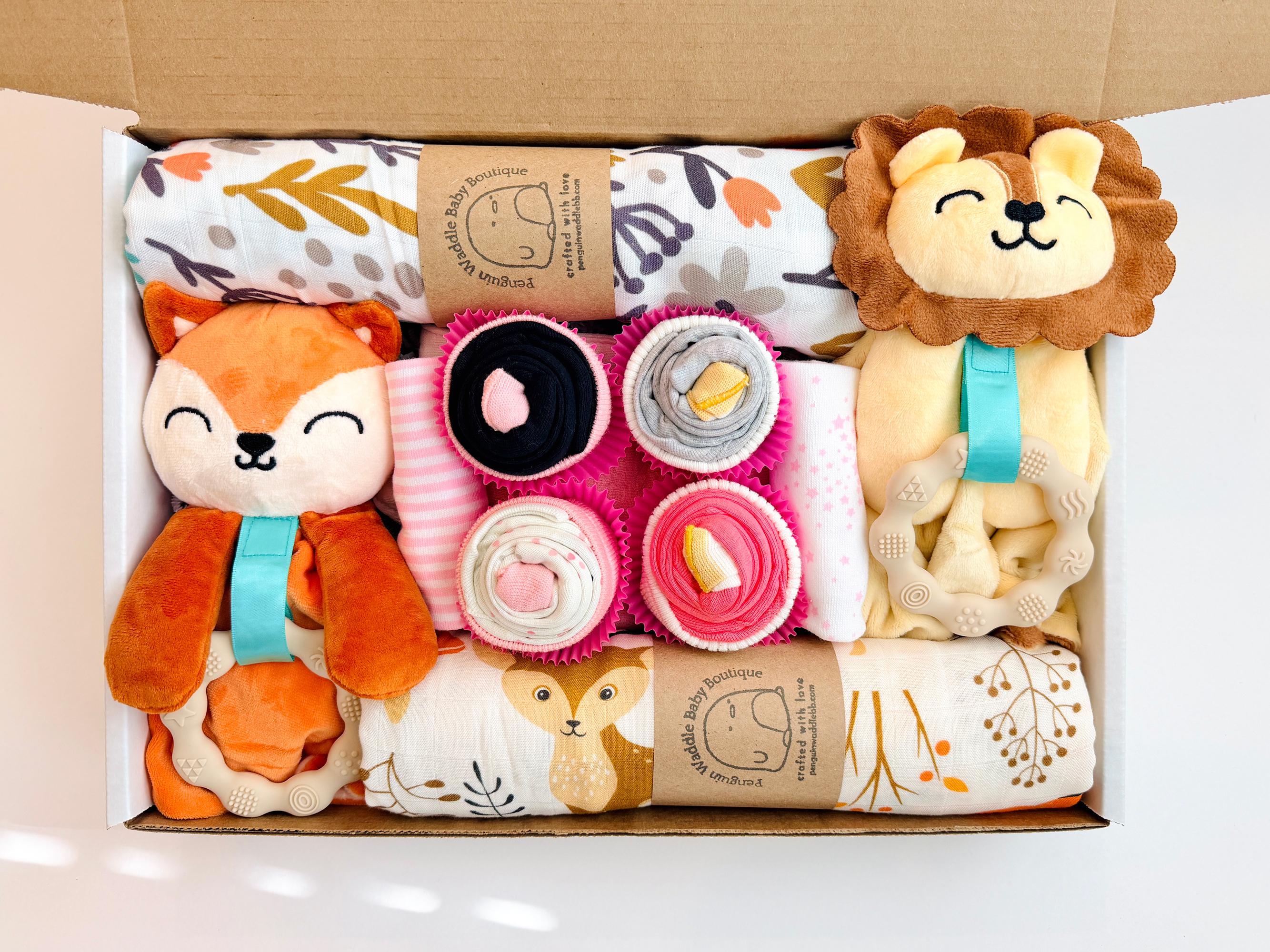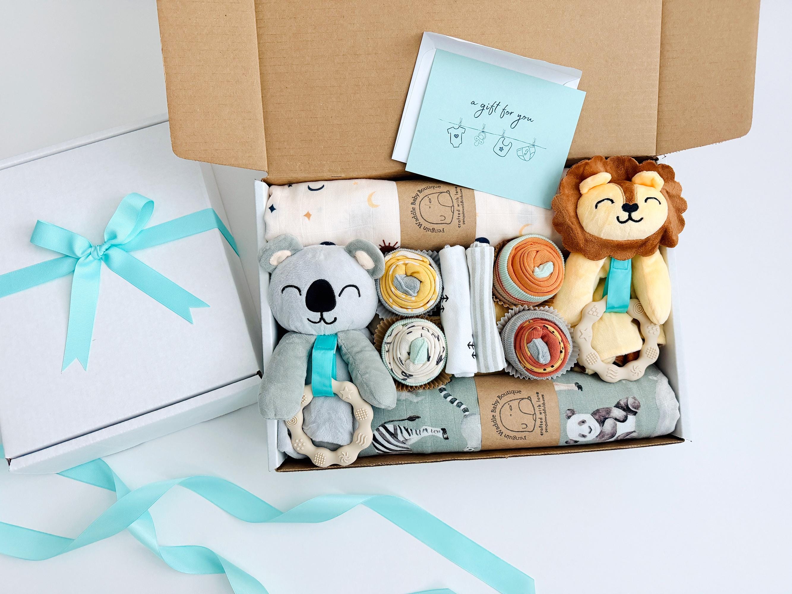 Welcome the newest little duo with our personalized twin baby gift box! A beautifully curated set designed to celebrate double the joy! Thoughtfully crafted for twins (or if you want double the love for one baby) this gift box includes: