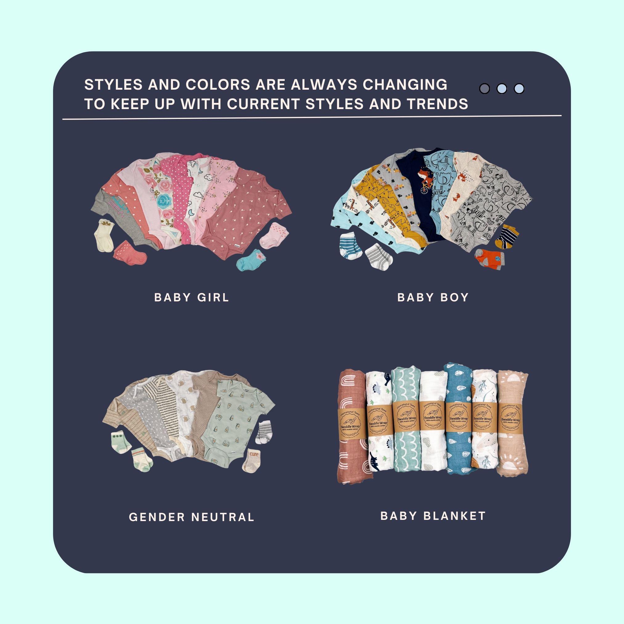 3) Four adorable baby Onesies®. Ideal for everyday comfort. We send 0-3 month and 3-6 months sizes. Larger sizes may be available upon request.
