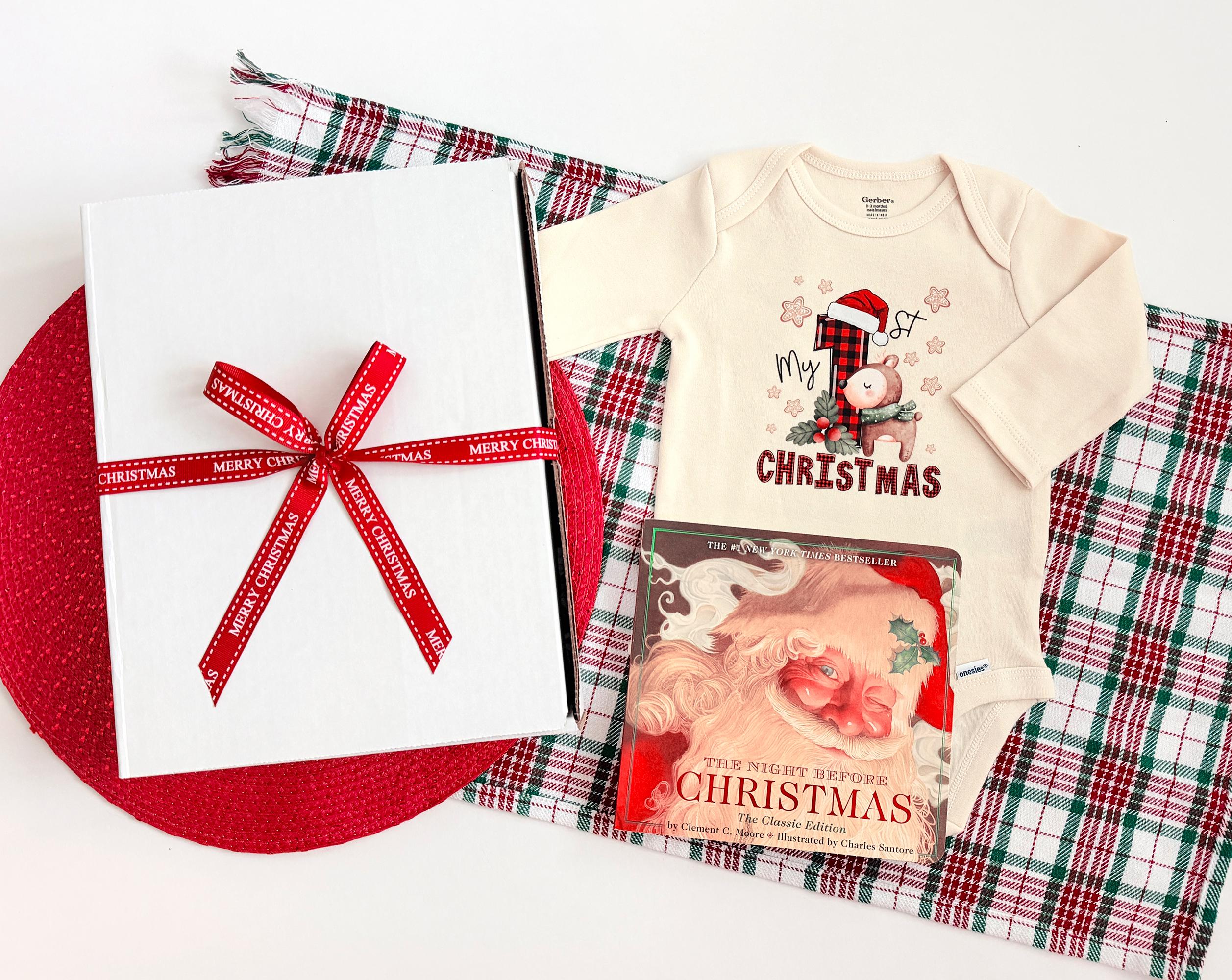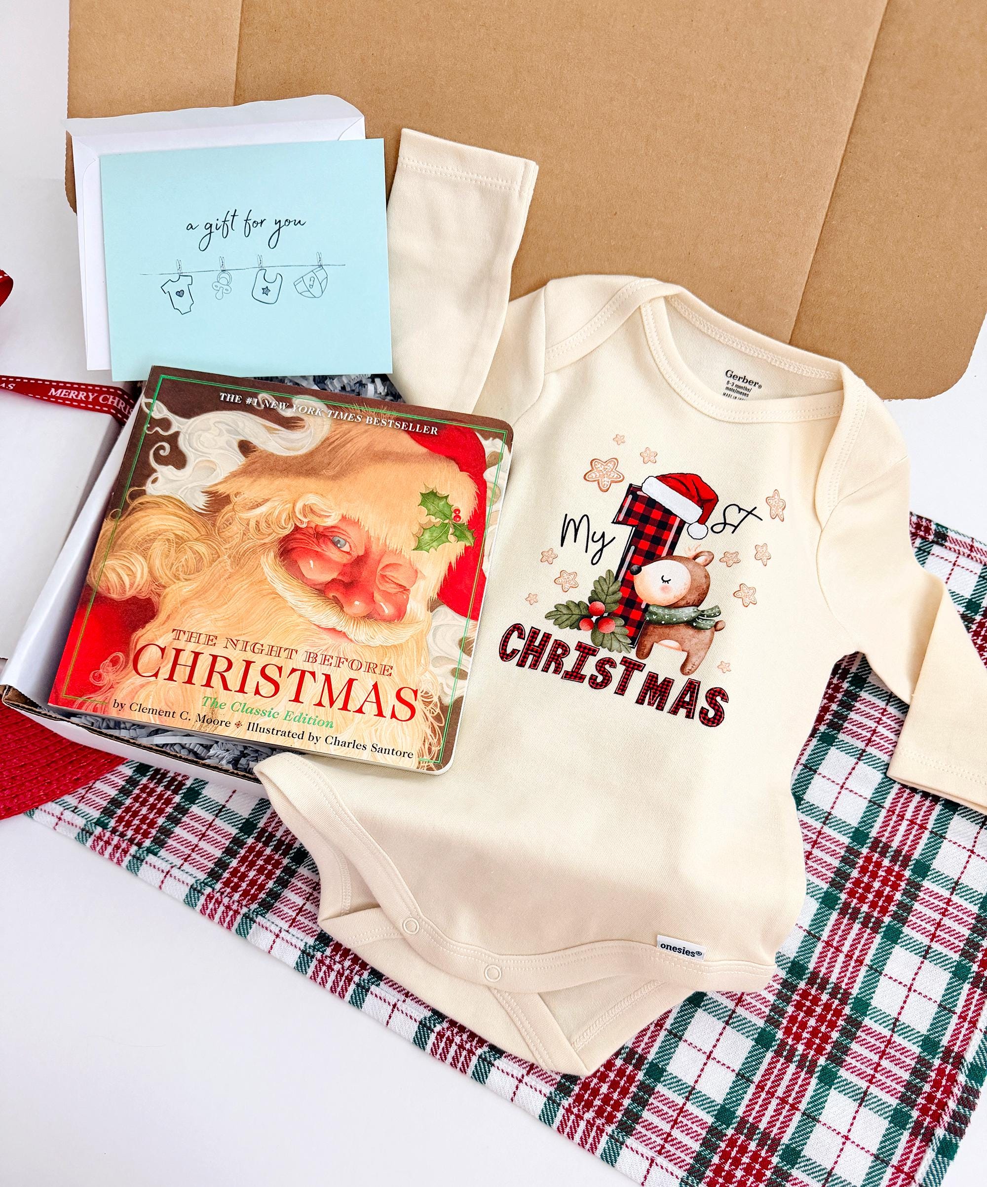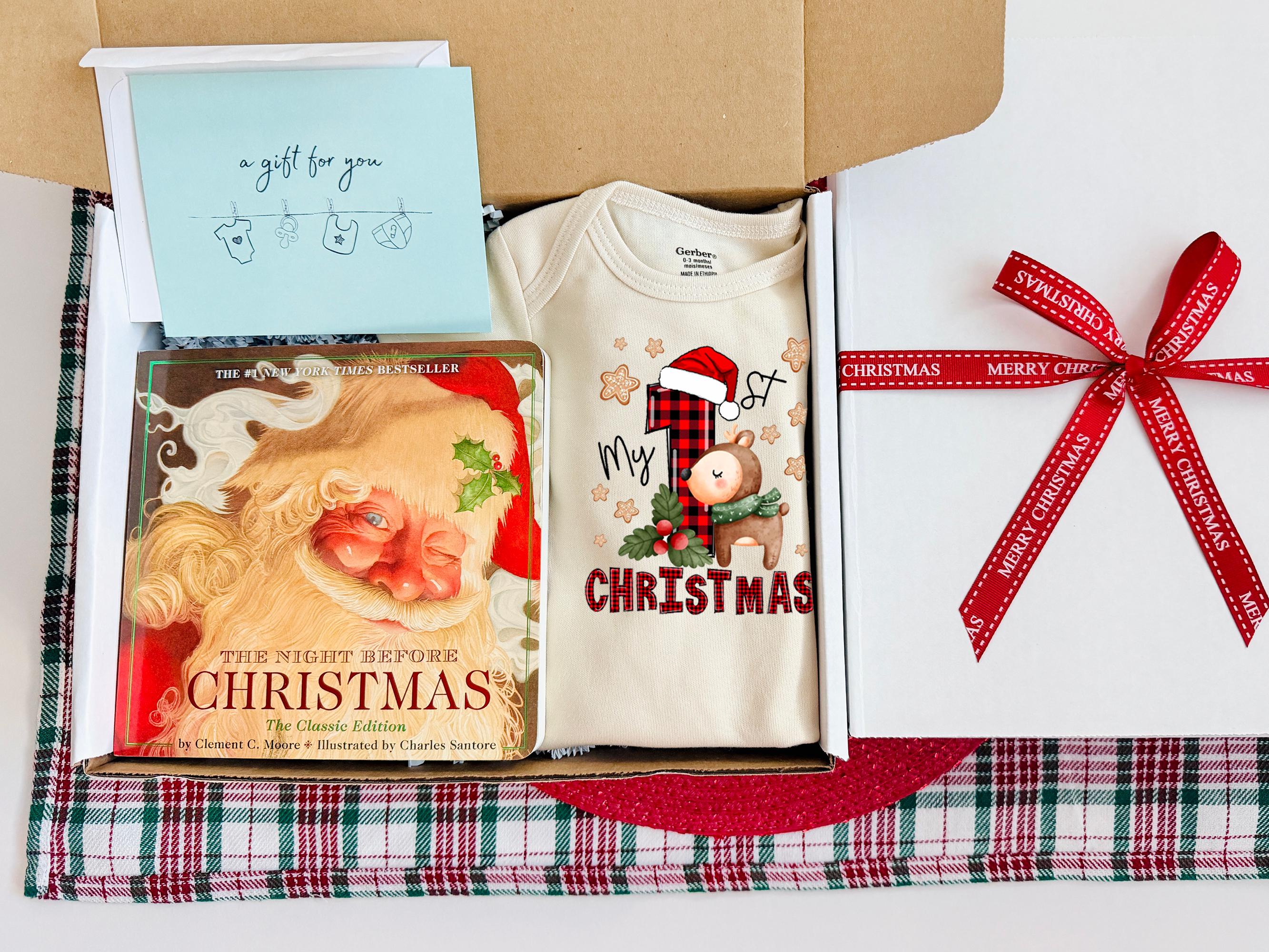 Celebrate baby's first Christmas with this adorable gift box featuring a "My First Christmas" onesie and the classic "The Night Before Christmas" board book. Available in various sizes and in boy, girl, and gender neutral styles with optional gift wrap. Perfect holiday baby gift!