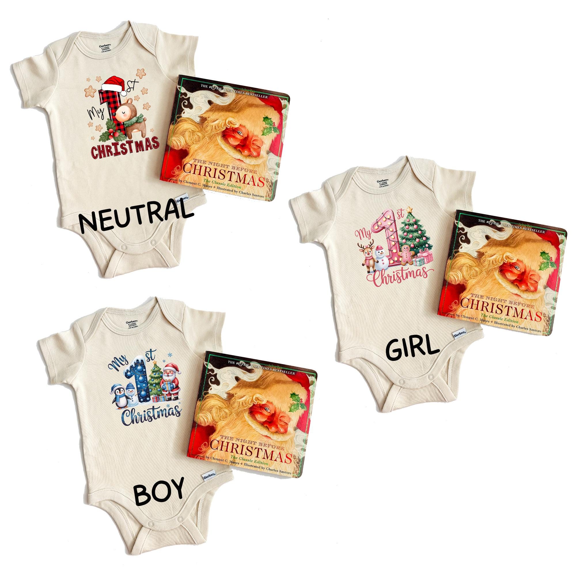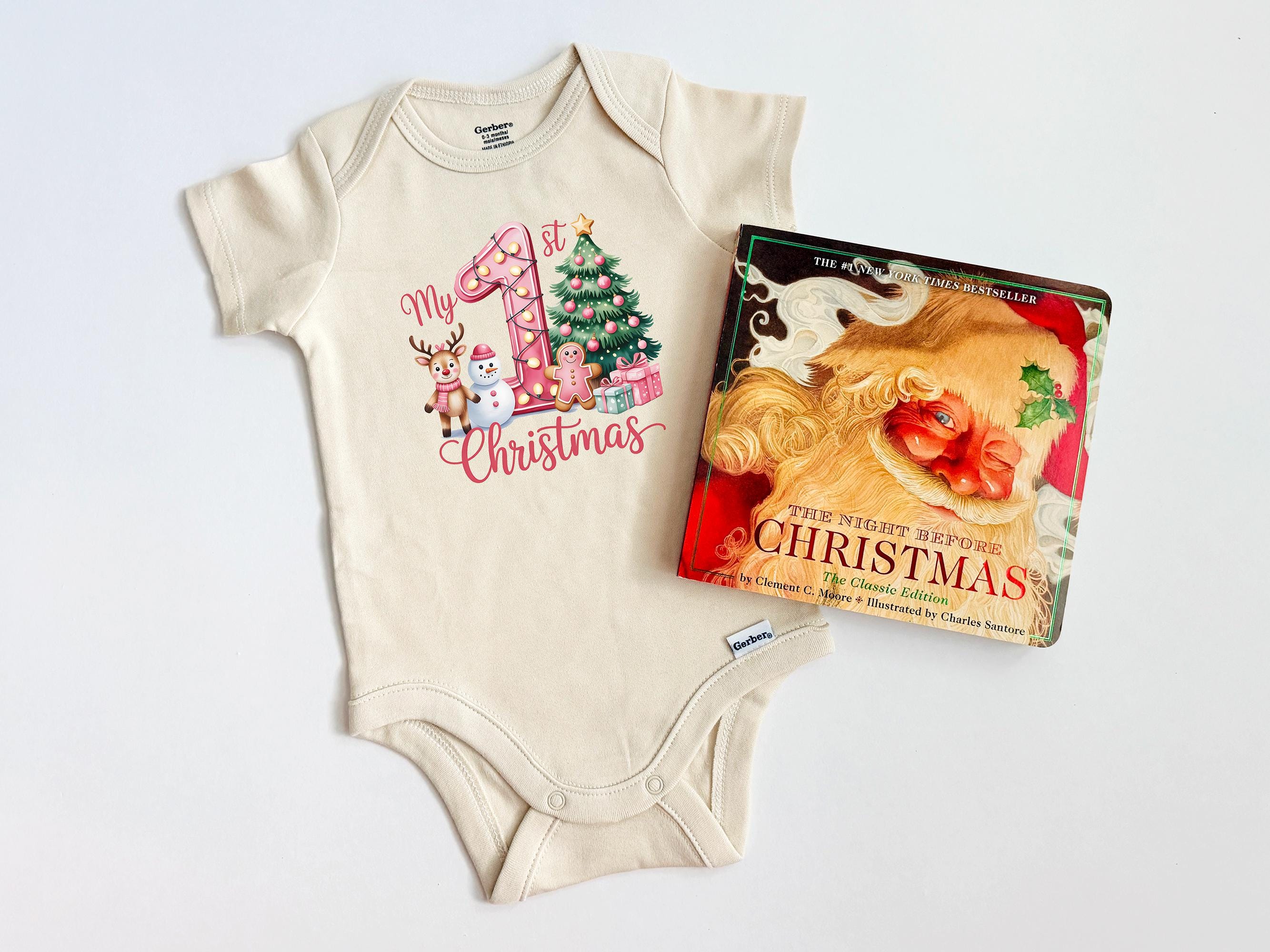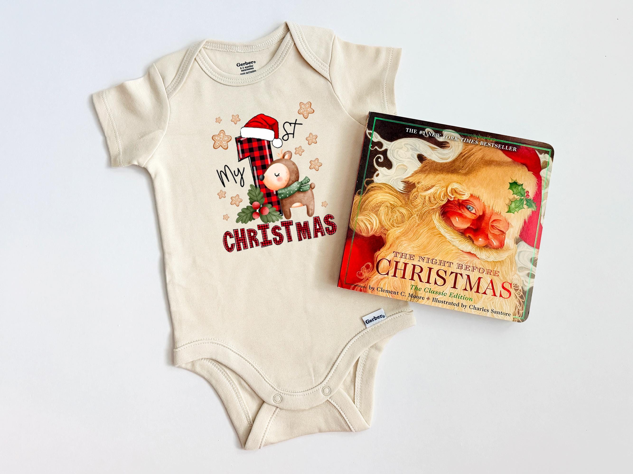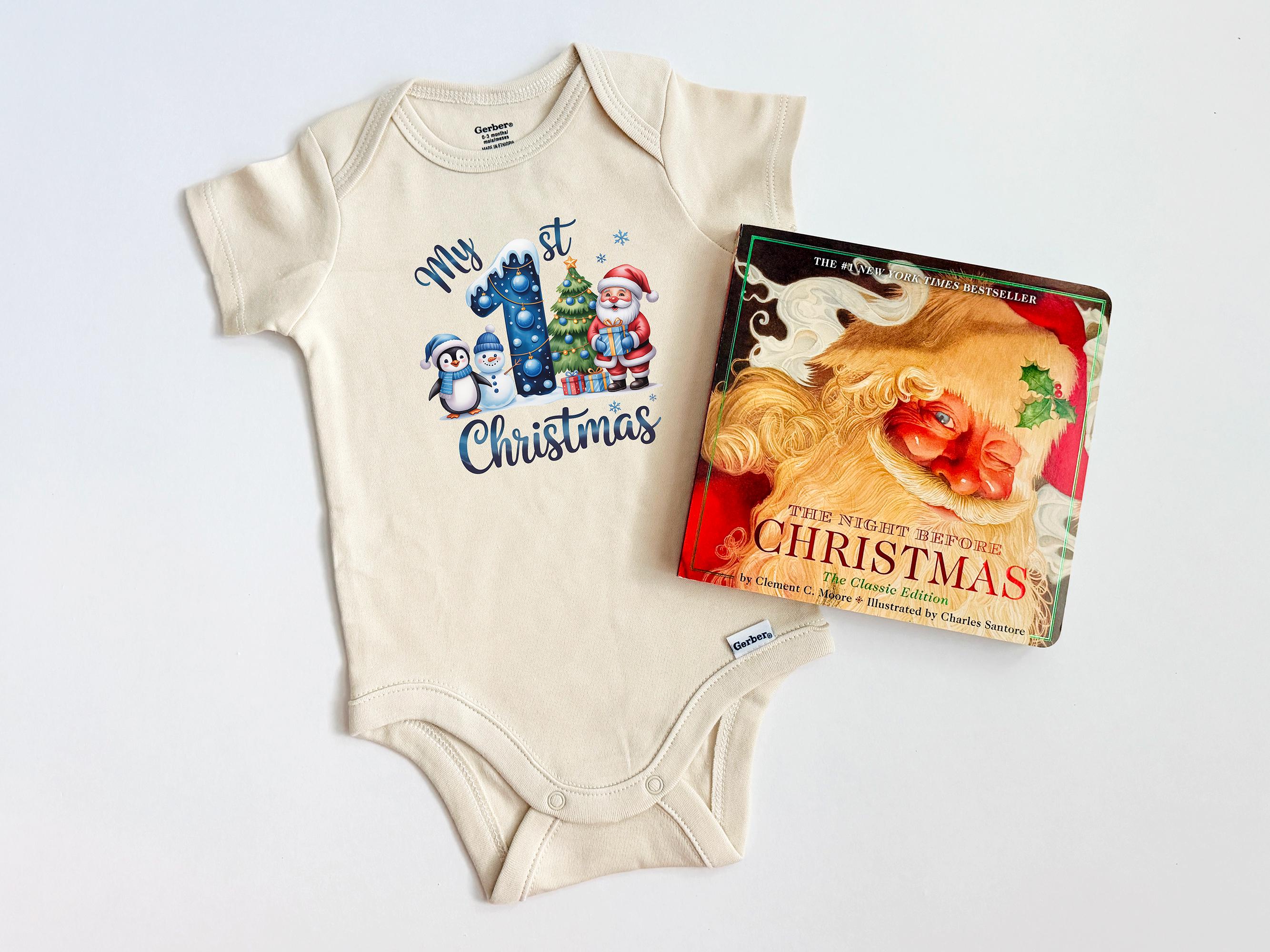 Celebrate baby's first Christmas with this adorable gift box featuring a "My First Christmas" onesie and the classic "The Night Before Christmas" board book. Available in various sizes and in boy, girl, and gender neutral styles with optional gift wrap. Perfect holiday baby gift!