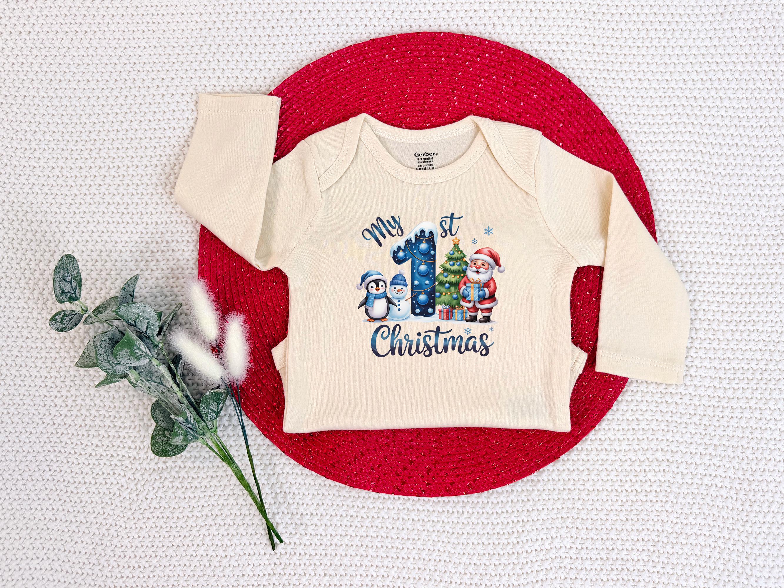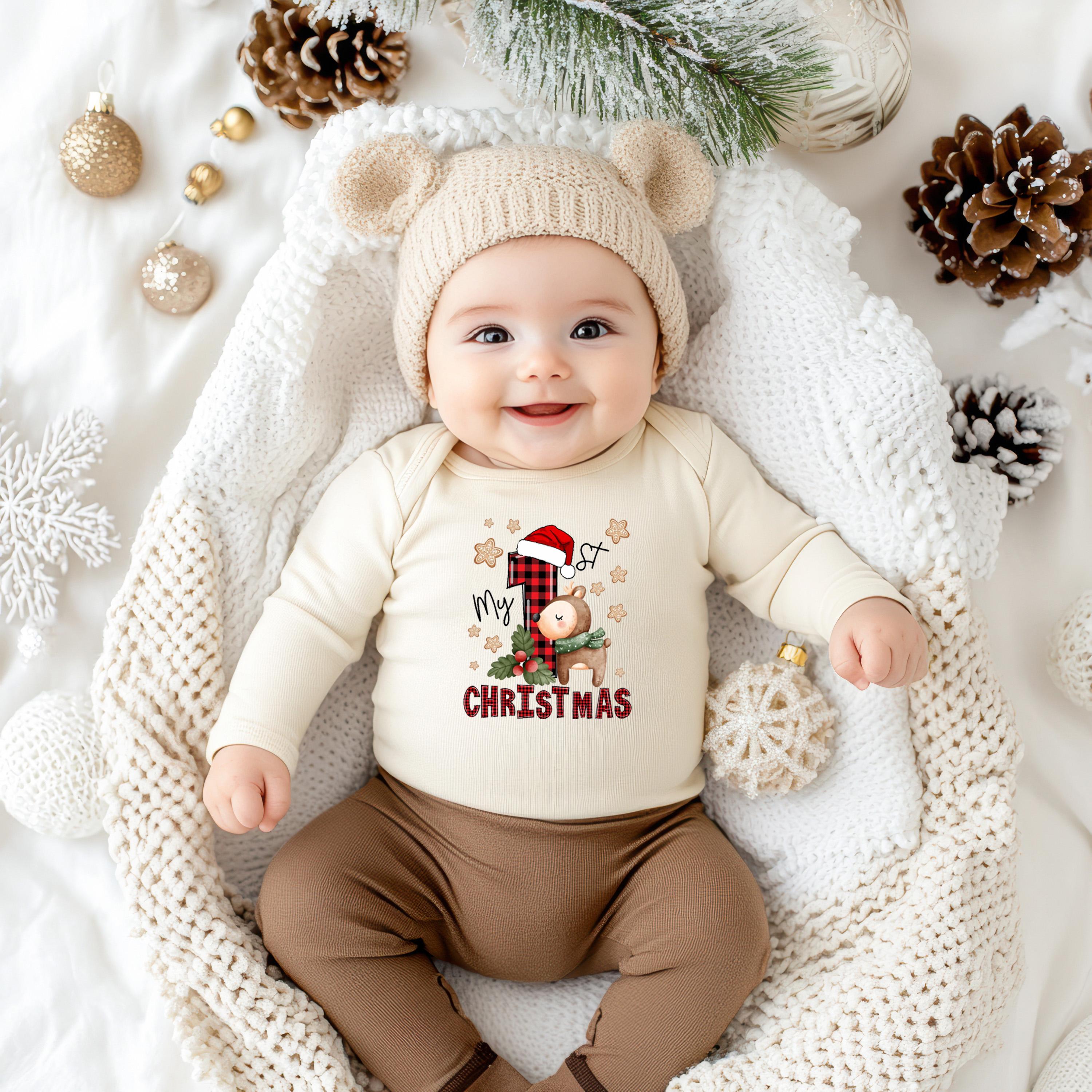 Features an adorable holiday-themed "My First Christmas" graphic on the front.